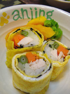 | 今日のモモごはん 出張から帰った翌日、今日は何もしないぞ〜と、ご近所のドッグカフェ・アンジンへ。 今日のモモごはんはアンジンのお子様(ワンコ)メニューの「ビックリ太巻き」。 これにあとでドライフードを追加。 |