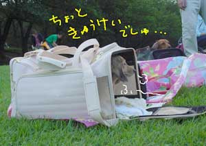 ミニかりんちゃんはキャリーバッグで岡村公園に到着したわ。