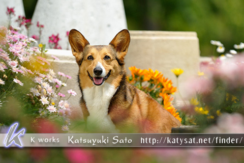 ちょっとおすましマロンちゃん。鮮やかなお花の中で。